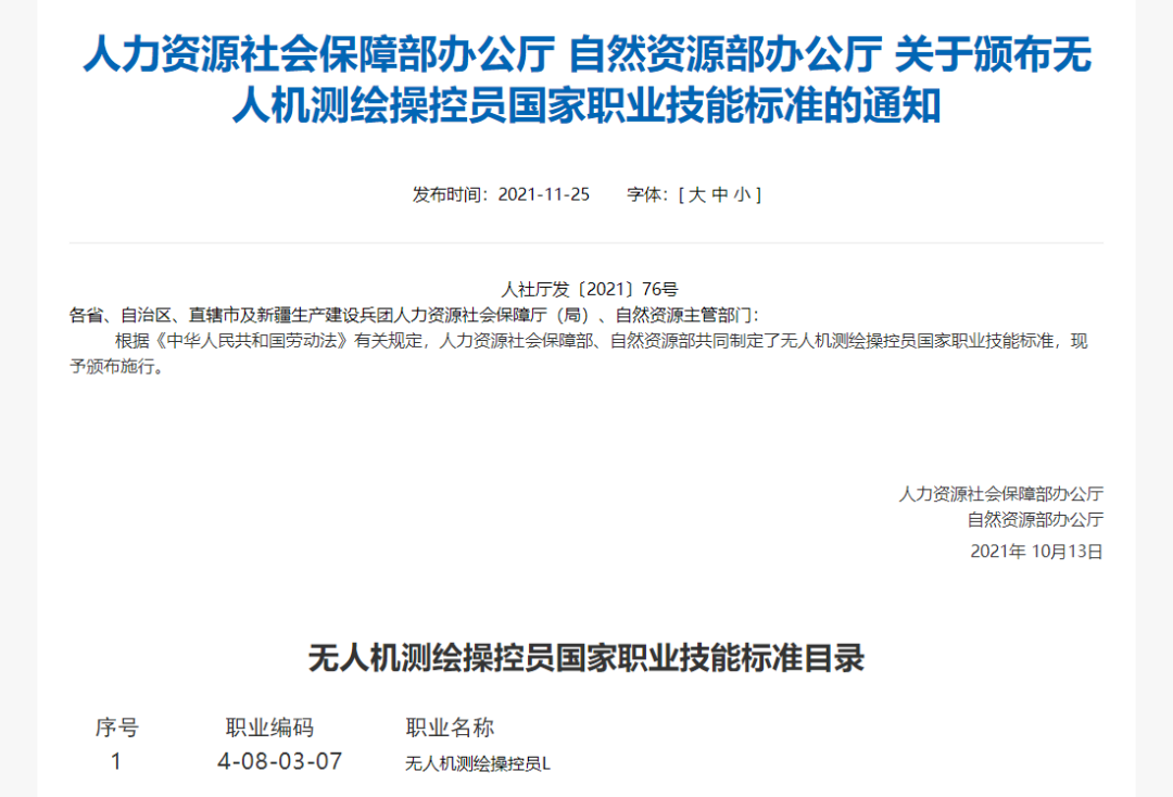 2021年11月25日,人社部、自然资源部发布无人机测绘操控员国家职业技能标准,职业编码为4-08-03-07,名称为无人机测绘操控员。