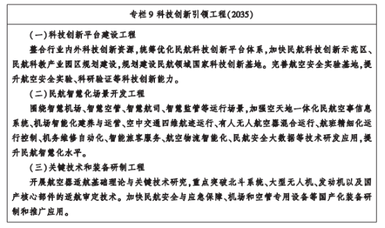 《规划》依据主要目标和重点任务,针对行业发展的堵点、痛点、痒点和难点,聚焦全局带动面广、问题针对性强和旅客切身感受最直接的领域,设置了6个重大工程专栏:容量挖潜提升工程、航空运输便捷工程、民航绿色低碳工程、科技创新引领工程、人才强业工程、产业协同示范工程。